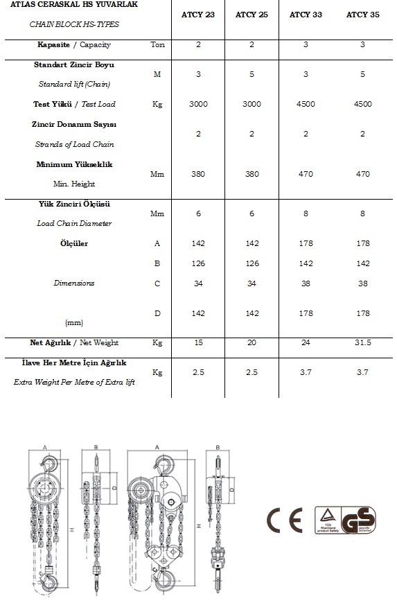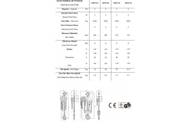 ATLAS HS Serisi Yuvarlak zincirli caraskal vinç ev, bahçe, atölye, servis ve her yerde fiziksel zorlanma olmadan kolayca yüklerin kaldırılması için basit, kullanışlı bir yardımcıdır.Atlas ATCY 35 model ceraskal 3 ton yük taşıma kapasiteli 5 metre standard zincir uzunluğu vardır. Atlas ceraskal vinclerde bulunan HS serisi uzun operatör zinciri ve ince tasarımı ile, yüksek tavanlı kapalı alanlarda optimal kullanım avantajı sunar. Atlas ceraskalın kapalı metal gövdesi kasnağı korur ve düşük-dirençle çalışmasını sağlar. Oldukça emniyetli olan Atlas ceraskal vinçlerdeki emniyet mandalı yükün yanlışlıkla düşmesini engeller. Sağlam yapılı gövdenin yanısıra oldukça sağlam galvanize cincir sayesinde ceraskal vincin kullanımında sorun yaşanmaz.